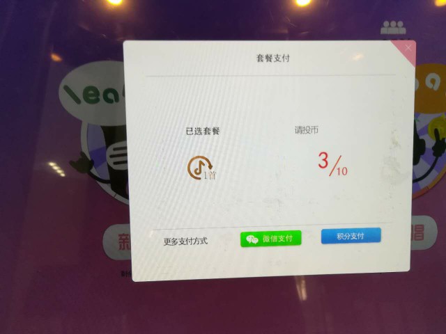 第二步:選擇付費方式“投幣支付”,“微信支付”或者“積分支付”,投幣支付只需要在主機柜下方投幣口投幣即可,點擊微信支付會彈出二維碼,掃描支付即可開啟你的點唱之旅。