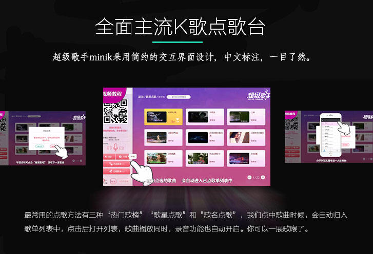 老少皆宜的觸屏式操作點(diǎn)歌界面、歌星、分類等點(diǎn)歌方式一觸即達(dá)帶來非凡的視覺易用體驗(yàn)。