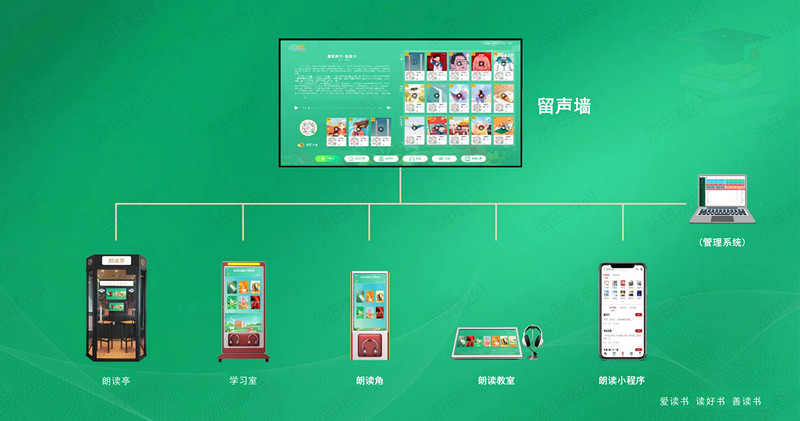 以“朗讀” “桌面聽書機”“朗讀終端” “留聲墻” “留聲卡”為載體,建設 書香校園,有聲校園等主題文化。